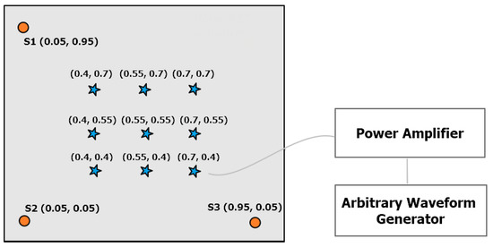 The acoustic waves are actuated in form of guided elastic waves via a tone burst of two cycles, central frequency of 250 kHz and nominal amplitude of Vpp, by means of an arbitrary waveform generator Agilent 33220A: its output was passed through a gated power amplifier RITEC GA-2500A (100× signal magnification) and then connected to an actuator, a Murata piezoelectric ceramic disk. Signals were acquired by a miniaturized acquisition system, the so-called piezoelectric ‘sensor node (SN)’ able to acquire, pre-process and characterize AE signals for real-time continuous monitoring. The core of the SN is the STMicroelecronics STM32F3, a low voltage 32-bit mixed signal microcontroller (MCU), which integrates both digital signal processing and floating-point unit instructions. The MCU features 40 kB SRAM and 256 kB FLASH memory, enough for the storage of data acquired by three AE sensors. The MCU embeds high precision analog components, such as four analog-to-digital converters (ADCs) with a resolution up to 12 bit via successive approximation and embedded voltage reference, four rail-to-rail input/output, low offset voltage programmable gain amplifiers (PGAs) and two 12 bit digital-to-analog converter (DAC) channels, which allow to obtain the maximum output swing. The frequency response of the device provides stable behavior from 10 kHz and 600 kHz, with a maximum attenuation of 3 dB. A complete description of the electronics is detailed in [31,32]. Each device of the network features up to three piezoelectric acquisition channels S1, S2, and S3, which passively acquire signals. Three piezoelectric sensors G150 whose frequency range lies between 60 kHz and 400 kHz were deployed at three corners of the plate, as schematically drawn in Figure 8, and a picture of the setup is presented in Figure 9.