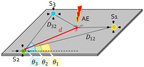A graphical rendering of the triangulation problem is pinpointed in Figure 10, where a generic plate is instrumented with a network of three sensors, namely S1, S2 and S3. If S2 serves as a reference sensor for the network, and represent the relative orientation of sensors S1 and S3 with respect to a horizontal axis crossing S2 and aligned along the longitudinal dimension of the plate; similarly, and indicate the spatial distance between the two pairs of sensors, S1–S2 and S3–S2.