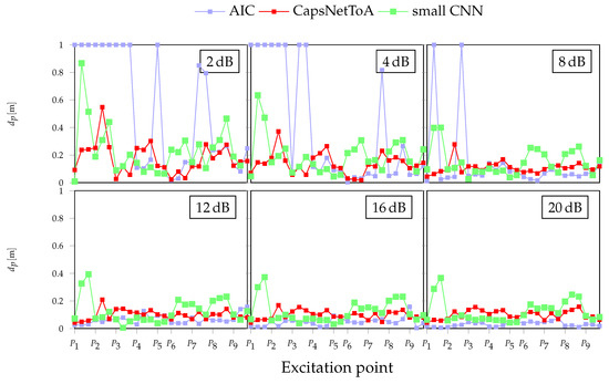 Moreover, it is possible to observe that the quite similar localization pattern shown by small CNN, which tends to worsen the lower the SNR, is a consequence of the noise generation procedure exposed in Section 3.1, according to which the same signal, but with different additive noise, is processed. For the same reason, even if less pronounced, an analogous trend characterizes also AIC and CapsNetToA.