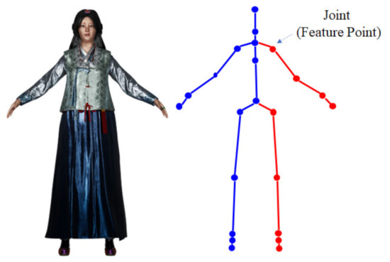 First, a 3D human pose of Figure 2 is used to find a matching point in an RGB image input from multiple cameras. Figure 1 gives an example of a human, and Figure 3 is the result of displaying the joints for feature points [29]. Since the performance of a pose estimation based on deep learning is sensitive to the condition of the object, the feature point by the pose estimation may have lower accuracy than the case of the special board. In order to obtain 3D coordinates of the feature points, calibration between the depth and the RGB image is performed, and 3D coordinates of the matching points are obtained from the depth map [29].