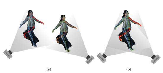 Recently, RGB-D sensors (cameras) combining RGB and depth sensors have become common and are widely used in various fields. The RGB-D camera helps to accurately and quickly extract the shape of an object and the 3D structure of the surrounding environment. RGB-D cameras have developed various fields such as SLAM and navigation [1,2], tracking [3,4], object recognition and localization [5], pose estimation [6], and 3D model registration [7]. The color components of the RGB-D camera are obtained using the RGB camera. On the other hand, depth information is obtained using various methods such as time-of-flight (ToF) cameras, laser range scanners, and structured-light (SL) sensors [8]. RGB-D cameras include the Azure Kinect of Microsoft [9], the Phoxi 3D of Photoneo [10], the Zivid Two of Zivid [11], the Helios of Lucid [12], and the RealSense of Intel [13]. These cameras have various properties (operational time, depth accuracy, cost, sensing method) according to their intended usage. Since human pose estimation is used for extrinsic calibration, the sensing method of using a laser is not suitable for this study, although it has a high degree of depth accuracy. The temporal calibration and registration for humans in motion require a high frame rate to capture and calculate depth map and RGB image, so a camera that uses a long operation time is not suitable for this study. For reliable and accurate scene representation using RGB-D cameras, intrinsic calibration of each camera and extrinsic calibration between two sensors are required. Recently, intrinsic parameter sets are being determined in advance, and these values are stored in non-volatile memory inside the device. In applications that perform imaging using multiple RGB-D cameras, such as real-time scanning/integration and capturing 3D geometry models, extrinsic calibration between multiple cameras is very important [14]. Since RGB-D cameras acquire both RGB and depth information, calibration between multi-view RBG-D cameras uses depth information, unlike the classical method such as multi-view camera-based calibration using only RGB information.The multi-view installation implies the existence of multiple cameras and simultaneous shooting. When performing calibration using RGB information and depth information simultaneously, the depth information generation method and process are considered [15]. To this end, we use a 3D human joint set (skeleton) as feature points to calibrate multi-view RGB-D cameras.