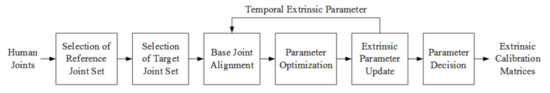 Next, the proposed extrinsic calibration will be described. Both methods can output a 3D joint set. However, it does not matter which pose estimation algorithm is used for each camera, and it does not matter if a different algorithm is used for each camera. Therefore, the joint set obtained for each camera may not have all the joints. If the estimated joint set has a subset of the entire joints, there is no problem performing calibration using only the acquired joints. The external calibration algorithm proposed by us is summarized using the flowchart in Figure 4.