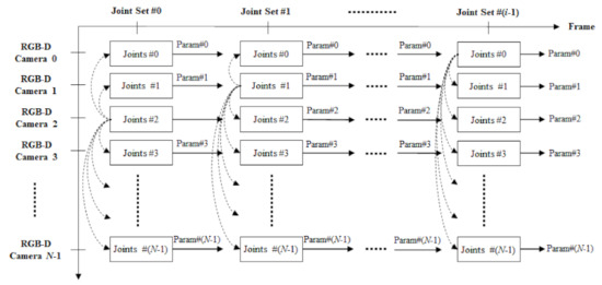 In Figure 5, the proposed technique for multiple frames is visually expressed. Using a joint set in multiple frames, each camera’s external parameters (Param#N) are obtained. Each camera can capture only a part of the human depending on the location where it is installed and can estimate only some joints of the joint set. For this reason, the number of the estimated joints as the feature points for extrinsic calibration can be variable, so it does not matter that the estimated joints are incomplete for each human. If the number of the estimated joints is less than the minimally required feature points (four joints in this paper), the skeleton should not be used in extrinsic calibration. If the joint set of a certain camera does not satisfy the minimum requirement, the calibration for this camera can be temporally continued in the next frames until the extrinsic parameter of the corresponding camera is estimated. As explained earlier, the extrinsic calibration is performed with overlapping joints of multiple frames. Joint sets without primary joints are excluded from calibration, and if there are fewer than four overlapping joints, calibration is performed after selecting a new reference joint set. After the finally acquiring and selecting the external parameters (Param#N), 3D static registration is performed using the joint set information predicted from each camera.