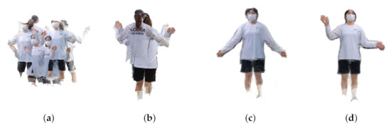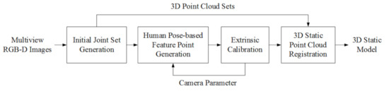This section describes the overall process for 3D registration. When the transformation parameters of the multi-view cameras are previously obtained, 3D registration may be automatically performed. As described above, to perform calibration using a joint set, we use several frame sets. First, joint sets for these multiple frame sets are estimated (initial joint set generation). Then, joints of joint sets estimated from multiple frames are selected as feature points (human pose-based feature-point generation). First, one frame set is selected from among several frame sets. In this frame set, a joint set obtained from one camera is selected as a reference joint set, and one of the remaining joint sets is selected as a target joint set. When selecting two joint sets, at least three or more joints, including the reference joint, should satisfy the corresponding condition. Next, the two selected joint sets are aligned based on the primary joint. Through this, transformation parameters between the two cameras are obtained. This process is repeatedly performed for several frames and is performed until the transformation parameters converge (extrinsic calibration). Since the unaligned multi-view camera system is distributed at an arbitrary location, all or parts of the object may be included in the image acquired by each camera according to the size or location of the object. In the worst case, all cameras may capture only a subset of objects. In the case of a multi-view camera, as the object moves, the part of the object that each camera can capture may vary. In this case, extrinsic calibration is performed only with partial information captured by each camera. When extrinsic calibration is completed, a 3D model is generated by integrating the 3D point cloud using the transformation matrix (3D static registration) [34]. In Figure 6, the 3D static reconstruction algorithm is depicted.