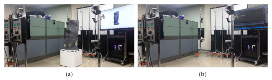 Figure 7 shows a picture of the experimental environment. For the experiment, eight Azure Kinects with a total of eight ToF (time of flight) RGB-D (depth) sensors were used. The camera can be located in various positions, and we experimented by placing two cameras on four sides. Eight cameras are input to one workstation through an optical cable-type USB 3.0 interface. Our system could operate the 3D registration in real-time (30 frames per second).