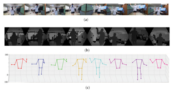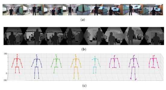 3D pose estimation result using the SDK of Azure Kinect (a) RGB image, (b) calibrated depth image, (c) estimated joint set in eight view-points.