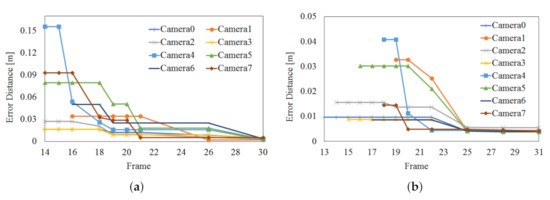 Figure 10 shows the optimization process of camera parameters using the joints of the joint set obtained from 8 viewpoints. After the optimization is completed through the process shown in Figure 10, 3D registration is possible in real-time using the 3D point cloud. Considering the optimization process of viewpoint 1 (reference) and viewpoint 2 (target), a transformation matrix is a obtained so that the overlapping joints of viewpoint 1 and viewpoint 2 can be overlapped in 3D coordinates in space. That is, an optimized matrix that can move the joint of viewpoint 2 to viewpoint 1 is obtained. The proposed algorithm performs optimization to obtain camera parameters for multiple frames. The experiment was conducted to stop the optimization when the error for the transformation result between the two viewpoints by the camera matrix obtained through optimization convergence to a constant value. In the case of the Azure Kinect in Figure 10a, optimization was carried out over about 30 frames (about 1 min). The position error by the transformation matrix finally converges to an average of 3.48 mm. In the case of Azure Kinect in Figure 10b, optimization progressed over about 74 frames (about 2.5 min). Finally, the position error by the transformation matrix converged to an average of 4.42 mm. This experiment confirmed that a transformation matrix with an error of about 3 to 4 mm could be obtained regardless of the type of 3D human pose estimation algorithm. In Figure 10, the frame numbers corresponding to the x-axis represent frames for significant updates.