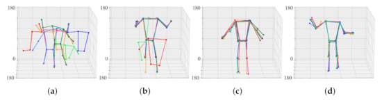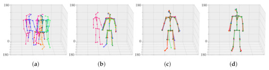 A reference joint set is first selected among the joint sets. Although the selection of the reference joint set does not affect the overall performance much, in general, one of the joint sets with the most joints is selected as the reference joint set. next, the target joint set is chosen in order that many joints overlap with the joints of the reference joint set. These two joint sets are first aligned with respect to their primary joints (vertebra and pelvis). The primary joints are defined as the two or three vertebra and pelvis joints. The used pose estimation algorithm decides the number of the joints because pose estimation algorithms may have different human skeletons. Next, based on the optimization function described in Section 2.2, the coordinate transformation parameters of the camera are obtained while matching two joint sets. This process is repeatedly performed for all joint sets, and this process is repeatedly performed for many frames until it converges to a constant error value. Finally, when the error converges, the parameter is determined as the final coordinate transformation parameter. The process of optimizing extrinsic parameters using multiple frames is explained using Figure 5.