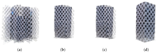 Figure 16 and Figure 17 show the results of 3D point cloud generation using the proposed technique. Figure 16a is the point cloud taken using eight RGB-D sensors. Figure 16b is the point cloud result obtained by 3D registration using the transformation matrices obtained after optimization for 15 frames. Figure 16b,c show the 3D registration results after 21 frames and 30 frames, respectively. In the case of Figure 17, the optimization result was converged upon after more frames were required. When comparing Figure 16 and Figure 17, although the number of frames required for optimization is different, the 3D registration results are visually similar in quality.