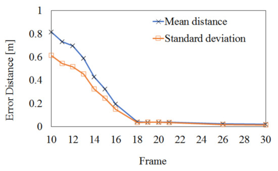 In order to quantitatively evaluate the effect of the proposed extrinsic calibration on the 3D registration performance, Figure 14 shows the registration error of the Charuco board by the proposed algorithm. The registration error is estimated by the Euclidean distance between the ground truth (the physically measured or computer-generated model) and the registered model. First, we located two models in the 3D virtual space and calculated the 3D point-to-point distance corresponding to the error (or difference) between the two models. Then, we repeated locating two models and calculating distance until finding the minimum mean distance. The 3D point-to-point distance is defined as the distance between the nearest points of the two models. In Figure 14, the initial mean error of 0.816 m is reduced to 0.0203 m after 30 frames and the initial standard deviation of 0.613 m is reduced to 0.0163 m. Since this experiment selected 1024 feature points existing in the Charuco board, it may have very high accuracy.