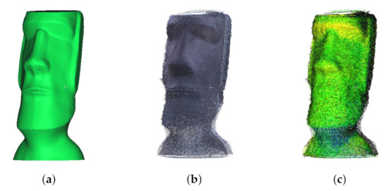 Figure 15 shows the results of the 3D registration of the Moai statue. We printed the Moai statue in Figure 15c with a 3D printer and used it in the experiment. In other words, we know all the 3D information of the actual Moai statue. It is rather difficult to judge the results of the three-dimensional point cloud as a two-dimensional image. However, it can be seen that the result of Figure 15c is very similar to the original object of Figure 15a. Figure 15c has the mean distance of 2.284 cm and the standard deviation of 4.036 cm. Therefore, a 3D object could be expressed with a relatively accurate 3D graphics model using the proposed method.