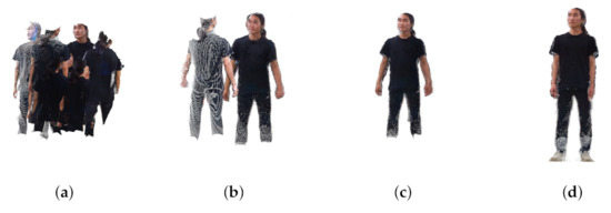 Generated point cloud (human #2) (a) before calibration, (b) after 18 frames, (c) after 73 frames, (d) 74 frames.
