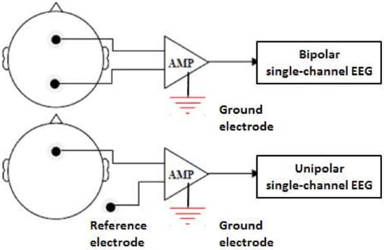 The type of EEG channels used may consist of either a unipolar or a bipolar channel (Figure 4). In the case of a unipolar channel, each electrode records the potential difference, which is compared to that of a neutral electrode, connected to an ear lobe or mastoid. Bipolar measurements show the potential difference between two paired electrodes. Currently, the majority of DDD studies focus on the EEG difference between alert and drowsy statuses, and few of them reported the hemisphere superiority phenomenon. Therefore, the bipolar channel may provide sufficient information for EEG-based DDD. However, for EEG-based emotion recognition research, for example, a unipolar channel is more suitable because it is necessary to compare the EEG changes between the right and left hemispheres [89].