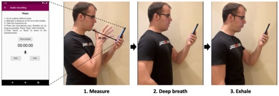 Data collection process. The participant opens the app, moves the phone to the indicated distance (20 cm), takes a deep breath and exhales.