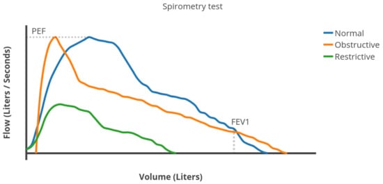 Figure 2 shows an example of flow vs. volume plot, generated by a spirometer [11,20]. FVC plot is similar to an exponential density function (blue line in Figure 2) in healthy people. As obstruction the airflow increases, the flow rate decreases faster than exponentially after reaching its maximum value (PEF). Therefore, the distribution becomes as the orange line in Figure 2. When suffering from a restrictive lung disease, the respiratory muscles weaken and the lung capacity (FVC) decreases (green line in Figure 2). The shape is very similar to a Weibull distribution.