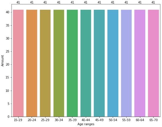Figure 4 shows the effects of applying the SMOTE algorithm to the original data corpus split in groups of 5 years. As can be appreciated, the data are evenly distributed between the age groups. Basically, SMOTE introduced additional synthetic data to the corpus. For each age group, the synthetic data added is the difference between the number of registers in Figure 4 minus the number of registers in the same column of Figure 3.