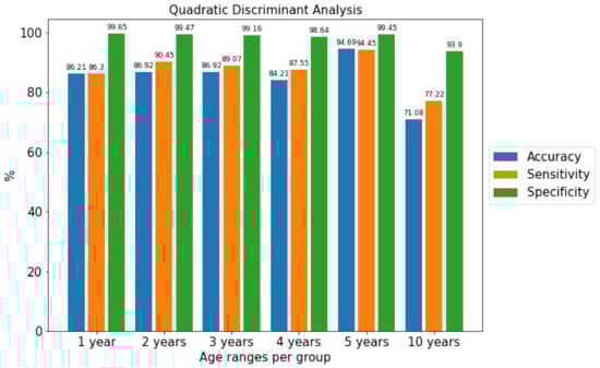 Comparison of the metrics of the best algorithm separated by age ranges using the Quadratic Discriminant Analysis algorithm.