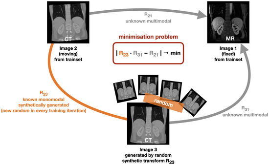 Our proposed self-supervised learning concept for multimodal image registration aiming to minimise a cycle discrepancy. In every training iteration, another (known) random transformation matrix R23 is used to generate a synthetic image. Like this, a cycle consisting of two unknown multimodal transformations (with the transformation matrices R21 and R31) and a known monomodal transformation (with the transformation matrix R31) is obtained, leading to the minimisation problem of that is used for learning.
