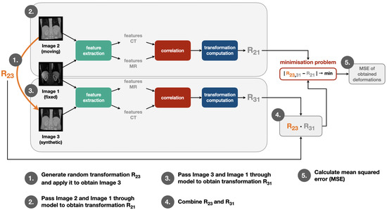 We apply our self-supervised learning strategy in the training procedure by going through the same steps in each training iteration as visualised in Figure 2: First, a random transformation matrix R23 is generated and applied on the moving image in order to obtain the synthetic image. Then, moving and fixed image are passed through feature extraction, correlation layer and transformation computation module to obtain the transformation matrix R21. The same step is also performed for fixed and synthetic image to obtain R31. After this, R23 and R31 are combined to obtain R23,31. Finally, the mean squared error of the deformations calculated with help of R21 and R23,31 is determined. The individual modules for this training pipeline are described in more detail in the following Section 2.3 and Section 2.4.