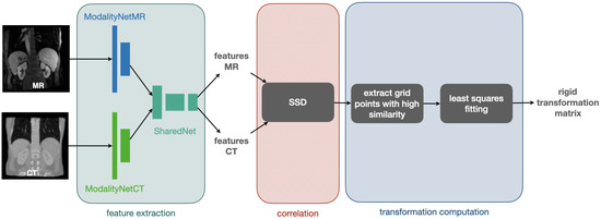 The process of feature extraction, correlation, and computation of the rigid transformation matrix: A CNN is used for feature extraction starting with a separate network part for each modality (ModalitiyNetMR and ModalityNetCT) followed by a module with shared weights (SharedNet). The obtained features are correlated by calculating patch-wise the sum of squared differences (SSD). Subsequently, grid points with high similarity are extracted and used to define point-wise correspondences to calculate the rigid transformation matrix with a least squares fitting.