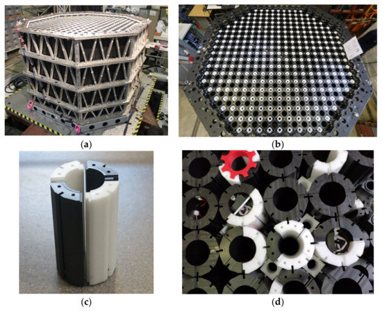 Multi-Layer Array rig and bricks: (a) Side view of MLA; (b) Top view of MLA; (c): A Quadruply Cracked Brick (QCB); (d) Detail of partially built MLA with intact, DCB, TCB, and QCB bricks, QCB brick held closed by red “spider” ring.
