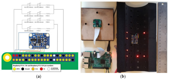 Based on the design requirements outlined in Section 2, a Raspberry Pi 3B was used for data acquisition. As a relatively compact, single board computer, the Raspberry Pi 3B offers a range of input ports and a powerful processor that provides versatility should instrumentation requirements change in the future. A Raspberry Pi v2 camera module and seven RS PRO Red Indicators comprised the optical system components. The camera was connected to the Raspberry Pi via the Camera Serial Interface (CSI) to produce 1920 × 1080 8 MP video at 30 Frames Per Second (FPS). Images were stored on a Toshiba Exceria M303 64GB microSDXC. This camera was selected for its wide 62.2° × 48.8° field of view (FOV), allowing it to capture a large area of the brick when in close proximity, its small geometrical size (25 × 23.86 × 9 mm), and low cost. However, the Raspberry Pi v2 camera has a fixed focus range from 1 m to infinity. To reduce this to a suitable range, the lens was unscrewed by 180°, resulting in images focusing from 10 cm away. The 6 mm RS PRO Red Indicators were selected based on their low cost, rigid fixing, and small size. An Adafruit BNO055 Absolute Orientation Inertial Measurement Unit (IMU) was selected for its ability to combine a triaxial 16-bit gyroscope, a triaxial 14-bit accelerometer, and a triaxial geomagnetic sensor via a 32-bit microcontroller into a tiny 26.67 × 20.32 × 1.18 mm board. Both indicators and the IMU were connected to the Pi via the General Purpose Input/Output (GPIO) ports (see Figure 2a).