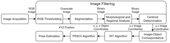 This section outlines how a 2D RGB image can be converted to a 3D pose relative to the camera. In summary, video footage of the brick is broken down into individual frames, as detailed in Section 5.1. Image Filtering first isolates and then identifies LEDs in an image, as described in Section 5.2 and Section 5.3. Then, the IRT algorithm uses rectilinear propagation to correct lens distortions and project the u, v LED image coordinates onto two virtual z-planes with real x and y positions relative to the camera, as presented in Section 5.4. Then, using the fixed and known position of the LEDs, the PRSOI algorithm can iteratively compute the six DOF pose of the brick relative to the camera, as per Section 5.5. The optical tracking methodology is summarised in Figure 3. All image processing was implemented in MATLAB R2019b.