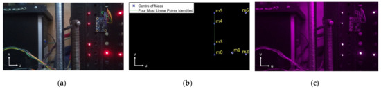 The 2D–3D correspondence is found by locating the four linear, coplanar LEDs (m0, m3, m4, and m5), allowing them to be quickly isolated from the other three LEDS. To find the four linear points, the algorithm comprehensively tests each of the 35 LED combinations () to find the optimal solution. To verify that the four points are collinear, one point is randomly selected from the group of seven as the reference position and termed Point A. The angle (θ) of each point (u,v) relative to Point A (uA, vA) can be computed using Equation (1). Note that θ, v, and u are shown in bold (indicating they are vectors) as the algorithm is vectorised to calculate the angle from Point A to each point more efficiently.
