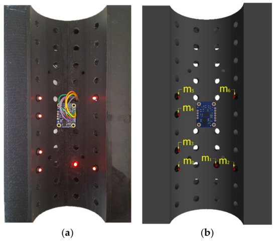 A prototype lattice brick was 3D printed from PolyLactic Acid (PLA) using an Ultimaker 2+ with a uniform pattern of 42 holes to insert LEDs and a small flat surface at the centre of the brick where the IMU was installed, as per Figure 2b. The system was implemented on a DCB rather than QCB so that it was possible to investigate several possible LED configurations and enable comparison against the motion-tracking instrumentation currently available in the lab. In this paper, the configuration of LED installation was set to 118° of the brick, which most closely simulated an arrangement that would work in a quarter-brick layout. When the system is installed in QCB bricks, the LEDs will be placed closer together (therefore occupying a smaller angle), which just changes the scaling of the LED pattern in the camera view. If necessary, this can be compensated for by using a camera lens with a narrower field of view. The most important issue in the installation of the LEDs is that the LEDs are not all coplanar, as coplanar points can lead to inaccuracies in the pose estimation