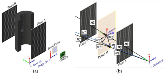 The notation of the algorithm can be described as follows. is the origin LED, and is a non-origin LED that is a z-distance from Plane M and a z-distance from the camera plane. When the calibration is undertaken in Section 5.4, and are projected onto Plane A to create and and onto Plane B to create and . is the non-origin point rectilinearly propagated onto Plane M, and is the non-origin point orthogonally projected onto Plane M. and are when is rectilinearly propagated to Plane A and B. Each of these points, , has an x, y, and z coordinate, which are denoted , , and .