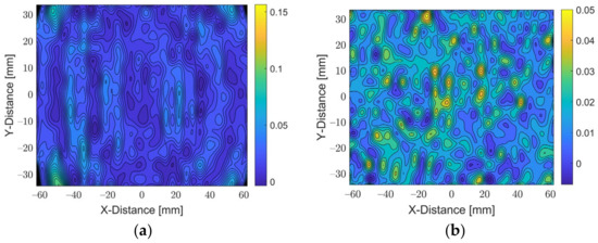 To evaluate the performance of the calibration, the coefficients were reapplied to the u and v calibration points found at Planes A and B. The error could be computed by comparing the position given by the calibration and the known position. The average and maximum error for Plane A were calculated to be 23.7 µm and 161.8 µm, respectively. Meanwhile, for Plane B, the average and maximum error were calculated to be 16.1 µm and 46.1 µm, respectively. The errors are visualised in Figure 8 and Figure 9 by a 3D error distribution map and an error contour. The error is small and noisy across both planes, only deteriorating in small areas at corners of the image, indicating that the calibration is robust and effective. This error could be further reduced by increasing the number of markers at the extremities of the frame, allowing the IRT calibration to account for the lens distortion and further improve the accuracy of the results.