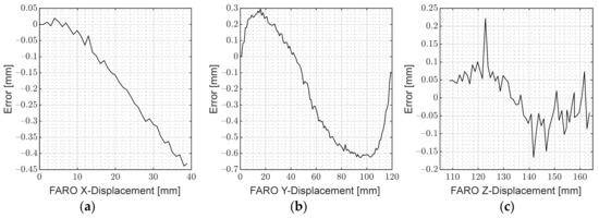 For the x- and y-axis error determination, both the optical algorithm and FARO arm were zeroed at one corner of the field of view (FOV) of the camera; then, they were translated in 1 mm increments until the brick reached the opposite corner of the FOV. The x- and y-axis error are shown in Figure 10a and b, respectively. The maximum and RMS error was 0.4386 mm and 0.2296 mm for x, and 0.6262 mmm and 0.3943 mm for y. The x-axis error shows a linear trend, which is likely due to misalignment of the camera and translation table. The y-axis error has a systematic sine-like error, which may be due to the 3D hemisphere centre of mass of the LEDs not being exactly the same as the 2D centre of mass. Nevertheless, the errors and noise are small, testifying to a rigorous and accurate image filtering methodology, a robust correspondence algorithm, and precise calibration.