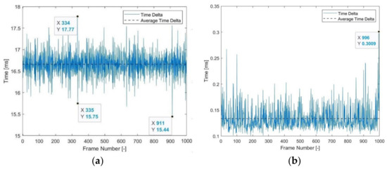 To test that the screen outputs the colours at the correct time, the screen is refreshed 1000 times at 60 Hz (refresh every 16.67 ms), collecting a timestamp when the beam reaches a specified position and the VBI timestamp with each refresh. The beam position timestamp demonstrated that the screen, on average, has an error of 0.0055 ms (0.03%) and a maximum error of 1.2260 ms (7.36%), as shown in Figure 11a. The VBI timestamp gave an average error of 0.0169 ms (0.10%) and a maximum error of 0.1672 ms (1.00%), as presented in Figure 11b. The error in both responses is due to unavoidable jitter and drift in the laptop’s Nvidia GeForce 940MX graphics card (Nvidia Corporation, Santa Clara, CA, United States) which is caused by the operating temperature of the laptop, fluctuations in the power supply, and other instabilities. Nonetheless, the maximum and average percentage error are small with respect to the exposure of the camera and, therefore, the screen synchronisation can be assumed to output the coloured screens at the correct time.