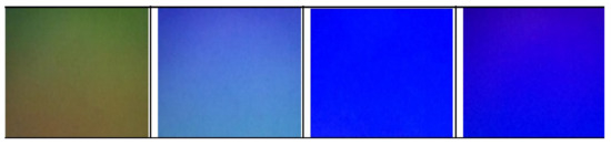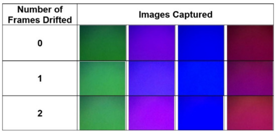 To ensure that the timestamp accuracy could be maintained for the typical 15 s duration of an MLA test, the screen and camera were tested for a 20 s period. In this time, the camera reported running at 60.2 Hz and drifting two full frames with respect to the screen. The initial images captured were compared with their corresponding colours at one and two frames of drift from 60 Hz, as shown in Figure 13. The frames with a reported drift of one and two frames yielded screen colours that were more similar to the initial screen colours than those exhibited when there is 8.33 ms of error as presented in Figure 12, showing that the error was less than 8.33 ms. As such, the timestamps were considered fit for purpose. Note that as an image was taken every 16.67 ms, these images presented are only a small subset of the images captured during the validation of the timestamps for conciseness, and the images taken were verified to drift only one frame rather than multiple frames.