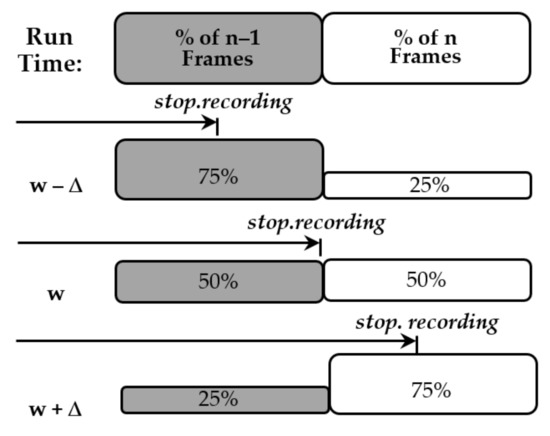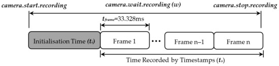 To investigate the initialisation time of the camera, the camera was run for a fixed time, w. The number of frames captured during this time, , and their corresponding timestamp can be subtracted from w to calculate the initialisation time, ti (see Figure 14). However, this does not give a precise value for ti because when the camera receives the signal to stop recording, it will finish capturing the current frame. Hence, the time at which the recording is stopped could be anywhere between the start and end of the last frame. Therefore, the data must be binned into frames, taking each bin’s time value as the time halfway through the last captured frame, n (see Equation (28)). If w is reduced so that it falls exactly between two frames, the variability in ti will cause equal proportions of n and n − 1 frames to be captured. By running the camera multiple times, the variability in ti can be accounted for by taking the average of the discrete initialisation times (Equation (29)). Note that as w is fixed and has discrete values based on the variability of , will be discrete.