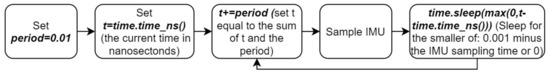 The timestamps of the IMU must also be shown to not drift, and the initialisation time must be quantified. The IMU initialisation is given as 400 ms by the manufacturer and can be taken into account in the sensor fusion. Although the IMU data will not drift, as the BNO055 has an internal 32 kHz clock source, the sampling of this data by the Raspberry Pi may drift. To ensure that the sampling of the IMU is at 100Hz and drift free, an adaptive time.sleep function was implemented, as shown in Figure 16. This code will not drift if the sampling of the IMU takes less than 0.01 s. To test this, the code was run for 10,000 iterations. The maximum sample time was found to be 0.00853 s, and therefore, it can be assumed that the IMU can be sampled at 100 Hz with no drift over time.