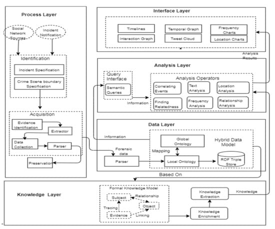 The process layer highlights the critical process areas for automation. These process areas include incident identification and evidence acquisition. This layer is also responsible for stating the parameters such as the scope and type of data extraction, specifying significant actors involved in an incident. A precise specification of incident parameters is required to automate the complete investigation procedure. An investigation process model for online social networks forensics was proposed to address this layer’s requirements in a previous study [].