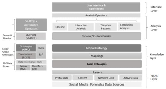 - Arshad, H.; Jantan, A.; Hoon, G.K.; Butt, A.S. A multi-layered semantic framework for integrated forensic acquisition on social media. Digit. Investig. 2019, 29, 147–158. [Google Scholar] [CrossRef]