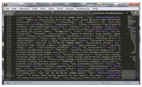 A Twitter scraper is used to automate data from online profiles. This scraper collects the data from online accounts using crawling behavior and Twitter API. The underlying scraping code that is coded in Python is obtained from an online source at (“GitHub-bpb27/twitter_scraping: Grab all a user’s Tweets (and get past 3200 limits)”, n.d.). However, the code is modified for making the metadata suit the requirements imposed by this work. The scraper code downloaded the raw data in JSON files, as indicated in Figure 4.