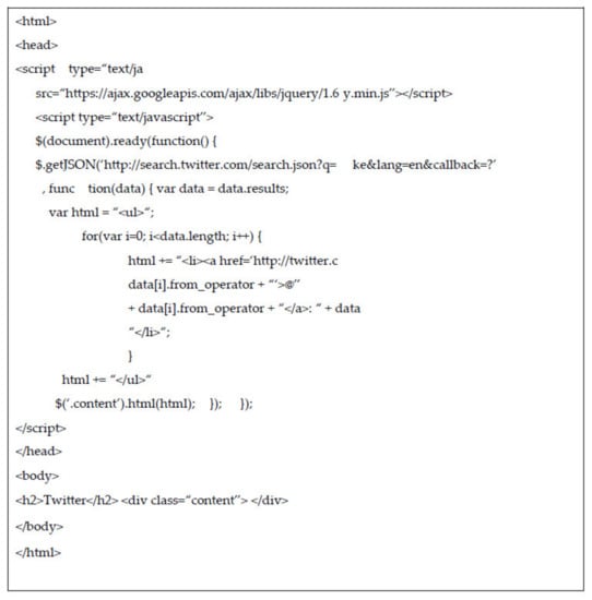 Twitter’s API: Twitter API, which is well documented and a suitable abode of helpful functionality, can be used to search for a specific term in Twitter and parse the results. The PHP codes for data recovery in Twitter are listed in Figure 6.