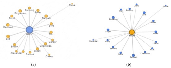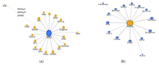 There are two types of directional interactions. The first is “By _Subject”. These are the communications sent or posted by the subject—Alice, in this case. The other interactions are the communications sent to, mentioned, or replied to the subject by her friends/followers. We used the number of retweets to measure the agreement between the subject and her contacts. Retweets refer to the tweets posted by others and retweeted by the subject. Retweeting conduct indicated a positive or supportive behavior towards the content being re-posted. Figure 10a represents the rate of tweets by subject, retweeted by her contacts. In comparison, Figure 10b indicates the retweets by subject and the users whose tweets are retweeted by subject.