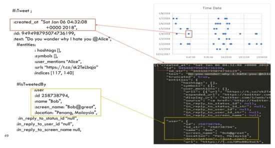 Content analysis on OSNs uses data mining approaches to identify a suspect or predict a [,,,,]. Several approaches use statistical and probability-based methods [,]. However, due to these methods and pre-processing mechanisms, they lose the data provenance during computations. Provenance refers to the source and record of an object. Establishing and managing the provenance of any item intended to use as evidence is crucial in forensics as it equates to the chain of custody. Thus, the metadata surrounding a digital object are recorded to demonstrate the authenticity of an item. These metadata include information such as the time of creation, the user’s identity, and modifications.