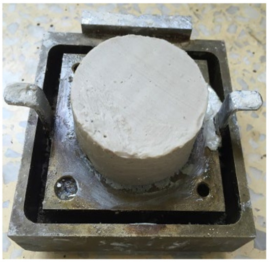 The deep-sea simulant sediment is sampled into a standard cylinder shape of 60 mm × 30 mm (Figure 1) [10] by a ring knife, considering that its water content (w = 165.6%) is between the plastic limit and the liquid limit. The sheer creep test of simulant sediment (with constant compressive stress) is conducted on a self-developed pressure-shear creep test device (Figure 2) [20] by our research team. The simulant sediment sample is placed in a shear box and burdens the effect of vertical weights (compressive stress σ) and horizontal weights (shear stress τ), i.e., the pressure-shear loading. Since the average grounding pressure σ0 (σ0 = 5 kPa) is the minimum standard for determining compressive stress and the average shear strength (τb = 6 kPa) is the maximum standard for determining shear stress, six different groups of constant compressive stress (σ = 5 kPa, 10 kPa, 15 kPa, 20 kPa, 25 kPa, 30 kPa) and six different groups of shear stress (τ = 1 kPa, 2 kPa, 3 kPa,4 kPa, 5 kPa, 6 kPa) are arranged and combined into 36 groups in total for direct shear creep experiment.
