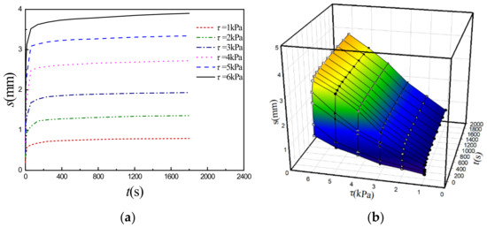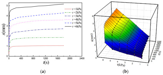Figure 3a and Figure 4a show the typical shear creep curves of the simulant sediment under different constant compressive stresses σ (σ = 5 kPa [20] and 10 kPa) as examples, which are obtained under different constant shear stresses τ. Based on the characteristics analyses of the curves, Burgers rheological model, i.e., shear stress (τ)-displacement (s)-time (t) equation (Equation (1)) is adopted to fit these experimental creep curves (s-t) and the four rheological parameters (K1, K2, β1 and β2) in the model can be auto-fitted and determined by Sigma-plot software with fitted curved 3D surface consisting of experimental creep curves and are relevant with different constant compressive stresses (σ).