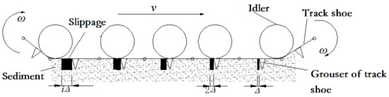 Figure 6 plots the simplified model of the miner’s motion on the deep-sea sediment [26]. It can be seen that the whole crawler comprises several hinged track shoes with uniformed distribution. To simplify calculation of the traction force, it is assumed that every track shoe I (i = 1, 2, …, n) is a “T” type with a grouser thrusting and shearing the sediment and moves at the same horizontal displacement. When the tracked miner moves forwards straightly at a constant velocity v, every vertical grouser of the track shoe i develops a horizontal shear displacement s (i.e., slippage iΔ). Choosing the whole crawler as an analysis object, as shown in Figure 7, the contacting force (i.e., grounding pressure σ(x)) on the track shoe is affected by the complex deep-sea topographies such as deep-sea mountains and ditches because of different contact conditions between track shoe surface and an idler. If every track shoe i moves under the action of traction force Ti and grounding pressure σ(x), it is also assumed that the track shoes have the same horizontal displacement s but different sinkage zi.