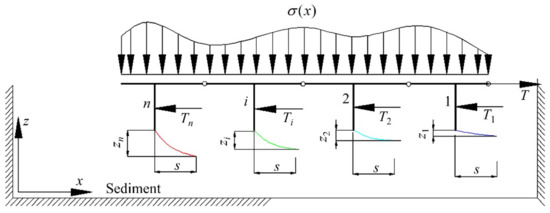 Taking into account the time-dependent parameter c(t) of shear strength and grounding pressure distribution σi (x) to Equations (4) and (12), the sum of time-dependent traction force Ti can be obtained as follows: