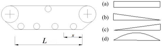 When the tracked miner walks on complex deep-sea topographies such as deep-sea mountains and sea ditches, different grounding pressure distributions develop under the crawler of the tracked miner. If the grounding pressure σi under every track shoe just changes with the horizontal location x but not with the time t, it is assumed that the types of grounding pressure distribution, relevant with the weight G of the tracked miner, can be simplified into four types: (a) uniform distribution with amplitude , (b) linear decrement distribution with amplitude , (c) linear increment distribution with amplitude , and (d) sine distribution with amplitude , as shown in Figure 9.