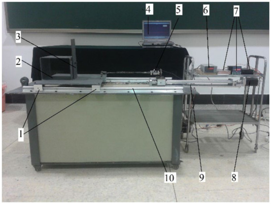 Traction force experiment apparatus of track shoe grouser. 1, Pulley; 2, Truck; 3, Grouser; 4, Computer; 5, NS-WL1 tension sensor; 6, Data collector; 7, Motor speed controller; 8, Motor; 9, Screw rod; 10, Rail.