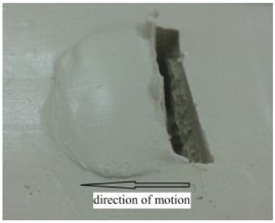 In order to verify the traction force model, the traction force experiment of a grouser is conducted on the apparatus designed by our research team as shown in Figure 10 [28]. It can be seen that simulant soil is prepared in the glass tank with a steel frame, and a grouser with width (4 cm) and height (4 cm) is fixed on a truck connecting with a tension sensor. Then, the constant compressive stress (5 kPa) is applied on the grouser (because there cannot be a distributed grounding pressure for only one grouser) with a constant velocity (v = 2 cm/s) from the motor controlled by a motor speed controller. When the truck with four pulleys moves along a rail, the traction force varying with time data from the tension sensor can be collected by the data collector and stored in the computer for analyses. Figure 11 shows a rut shaped by the grouser after the experiment [28].