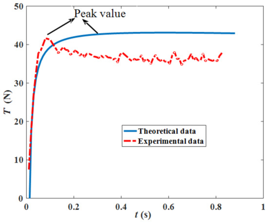 Figure 12 illustrates the two curves of an experimental way [27] and theoretical way for comparison by adopting the parameters listed in Table 3 (not mentioned parameters above). Since the curve from the experimental way is from one track shoe grouser by interacting with the deep-sea simulant sediment, letting n = 1 (only one track shoe grouser) in the Equation (13) under the uniformed grounding pressure, the theoretical traction force curve under the same condition as the experimental way is obtained, and it can be seen that the two curves are close and have basically the same trend of change, which proves that the theoretical values of traction force are reliable. The two curves have the close peak values, and it is important for evaluating the traction force varying with time and proves the reliability of the traction force model.